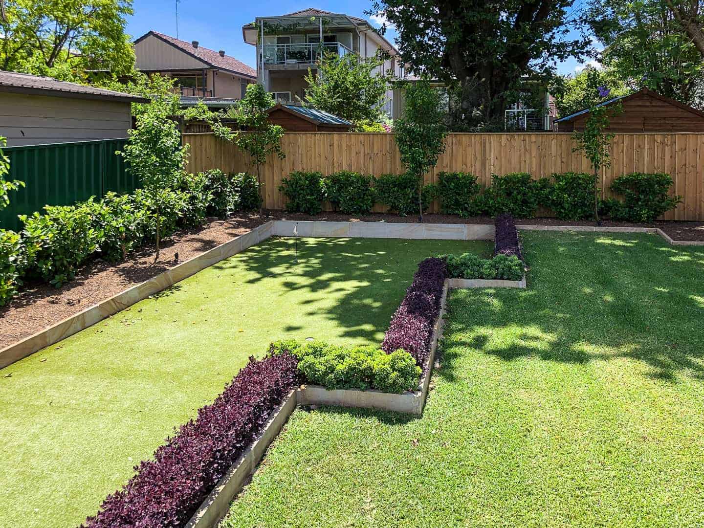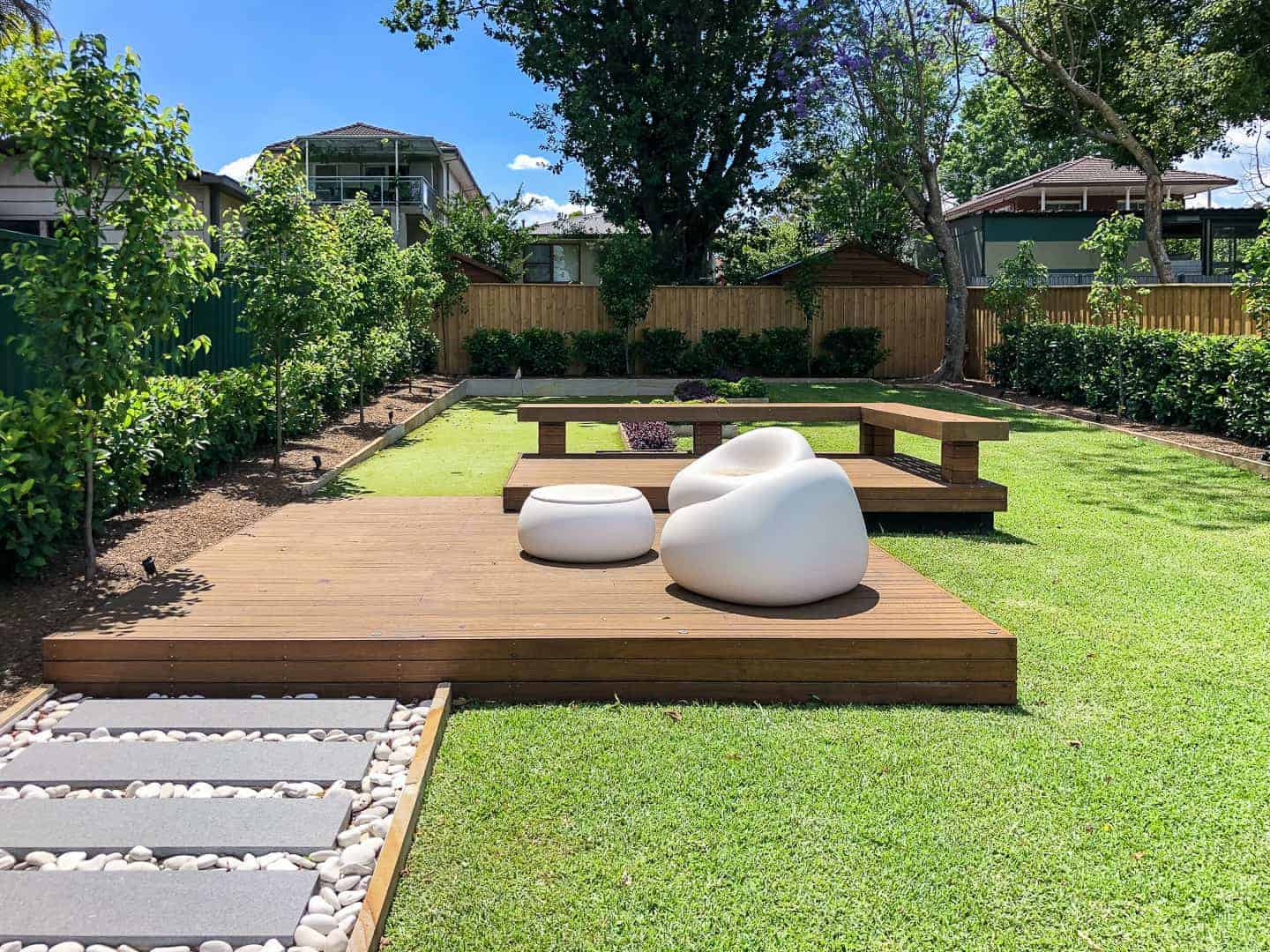 A worn back yard with some life brought to it includes a feature two levelled deck with bench seat, a mini putt golf green, granite stepping pavers, and sandstone edging around all of the garden.