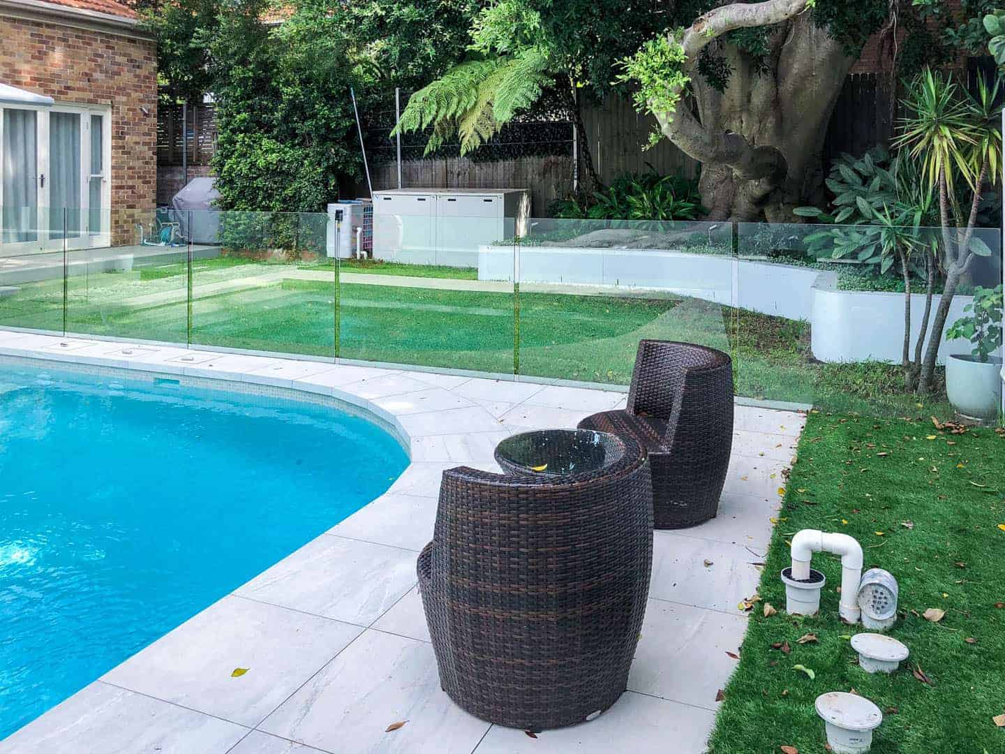 A large feature wall around the pool to act as soundproofing. Led lights. Frameless glass fencing, paving and turfing.