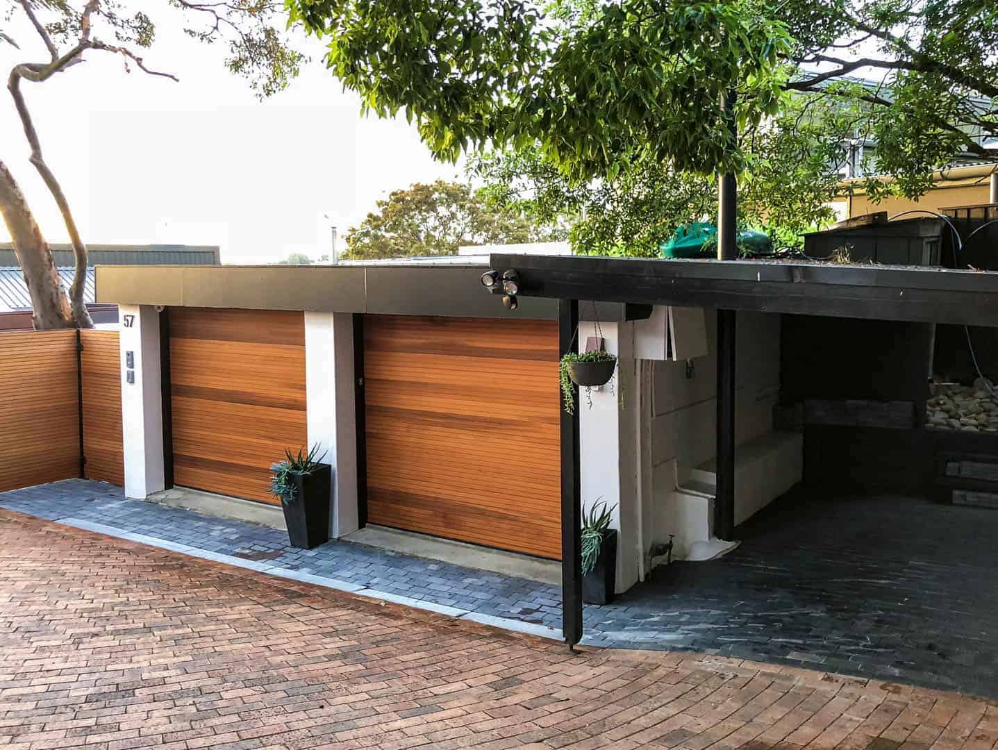 Front garage included bluestone pavers and stainless steel drain to separate the boundary lines from share driveway. Cedar gates and garage doors.