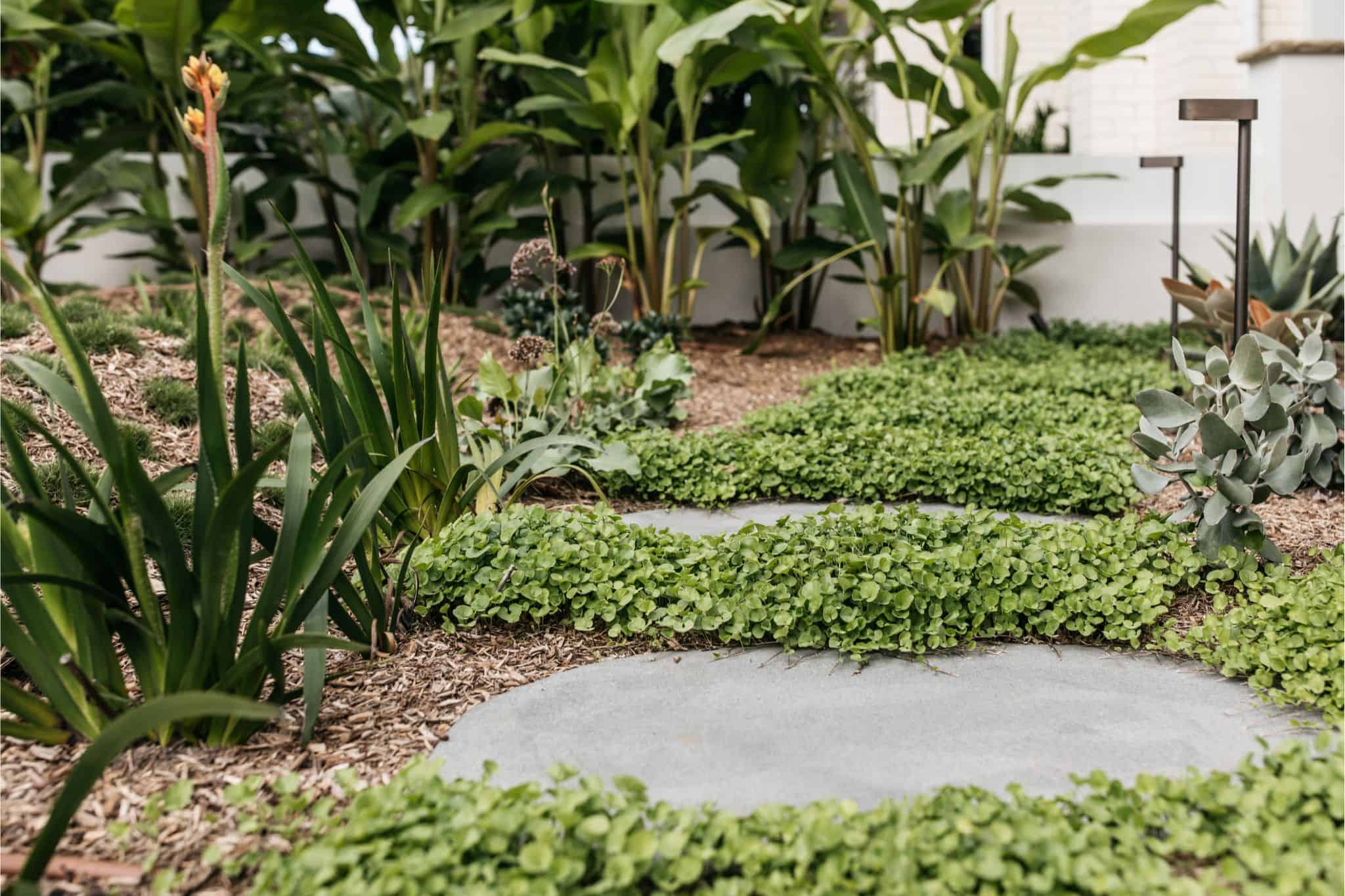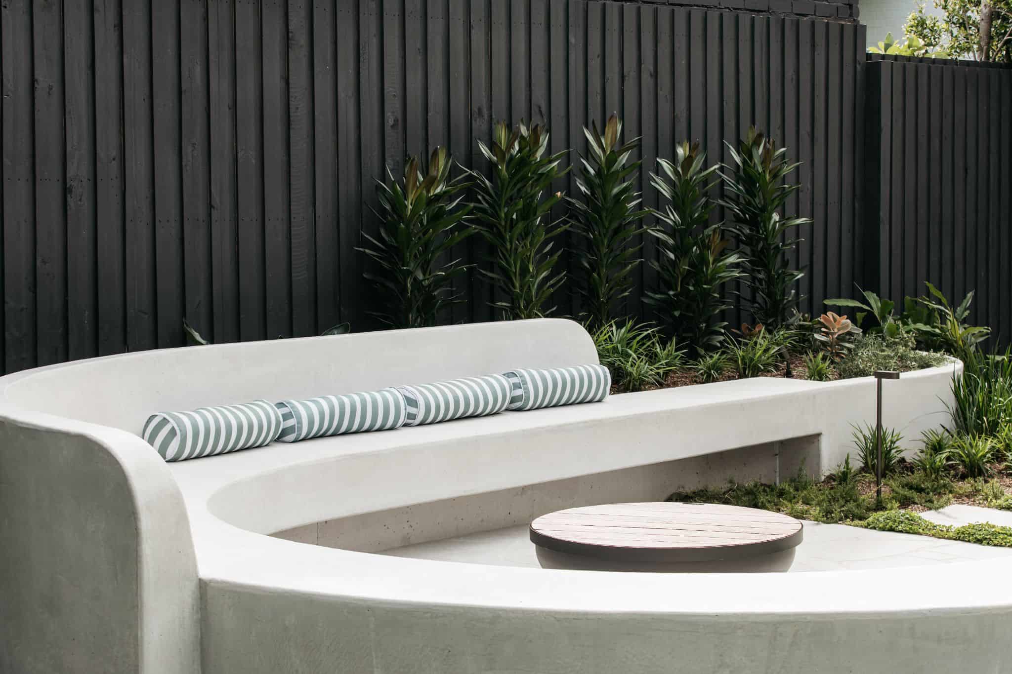 The backyard features a stunning social nook with built-in polished concrete seating, complemented by crazy paving stepping stones and a paved pad. A large open lawn provides ample space for children’s play, while a sleek, custom black-clad shed offers stylish storage. Lush tropical planting enhances privacy and softens the hardscape.